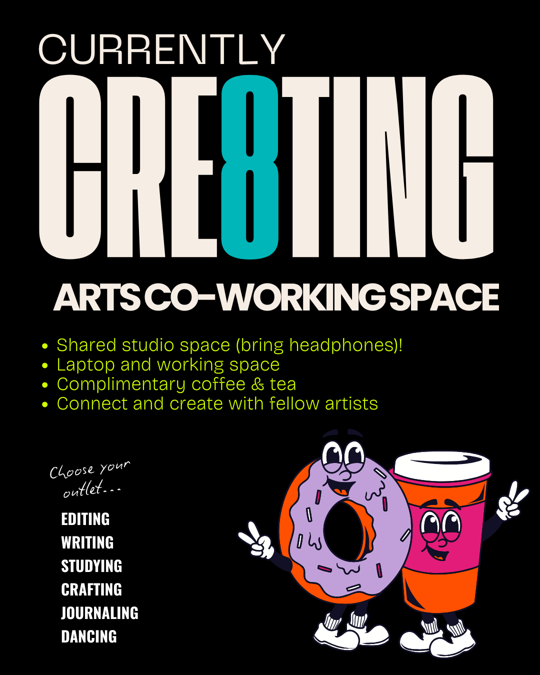 Your creative co-working space for artists, dancers, and makers. Drop in on October 8 & 22 from 3–5 PM for just $10 and enjoy shared studio space, laptop-friendly work areas, complimentary coffee & tea, and the freedom to create—whether you’re editing, studying, crafting, journaling, or dancing. Connect with fellow creatives, find your flow, and make Wednesdays your new hub for inspiration.